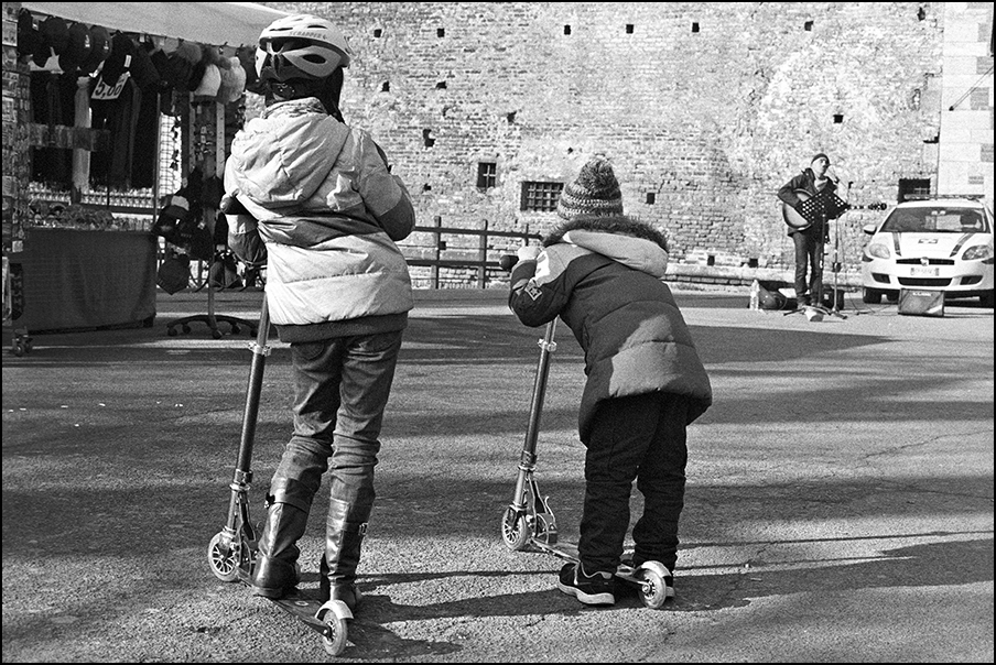 si esibiscono per chi ha qualche minuto di tempo per soffermarsi interessato ad ascoltarli, per i bambini incantati dalla magìa dei suoni e dei gesti, ma anche per quegli altri passanti frettolosi, che non sembrano nemmeno accorgersi della loro arte, offerta invece a tutti, liberamente, per aggiungere anche alla giornata più grigia ed ai momenti di maggior concitazione e urgenza della vita quotidiana qualche momento di ritmo e di armonia